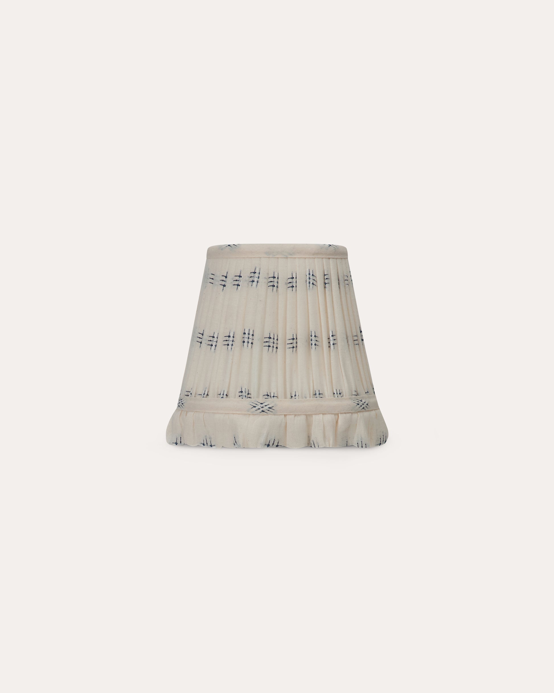 A patterned and ruffled lampshade defined by its delicate pale blue cross-stitch embroidery. Against a backdrop of our creamy lightweight cotton, the pairing is demure and gentle for bedside lamps or sitting room wall lights alike.