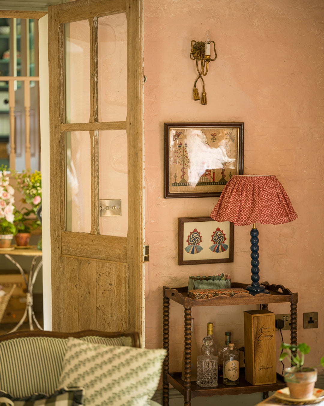 A soft flowing loose pleat lampshade made from 100% linen Florina in Crabapple – a small-scale floral motif in soft ivory, arranged in a rhythmic repeat across a rich red base. The pleating gives the fabric a relaxed, gathered look that feels both pretty and informal, while the crispness of the linen enhances the detail of the design.