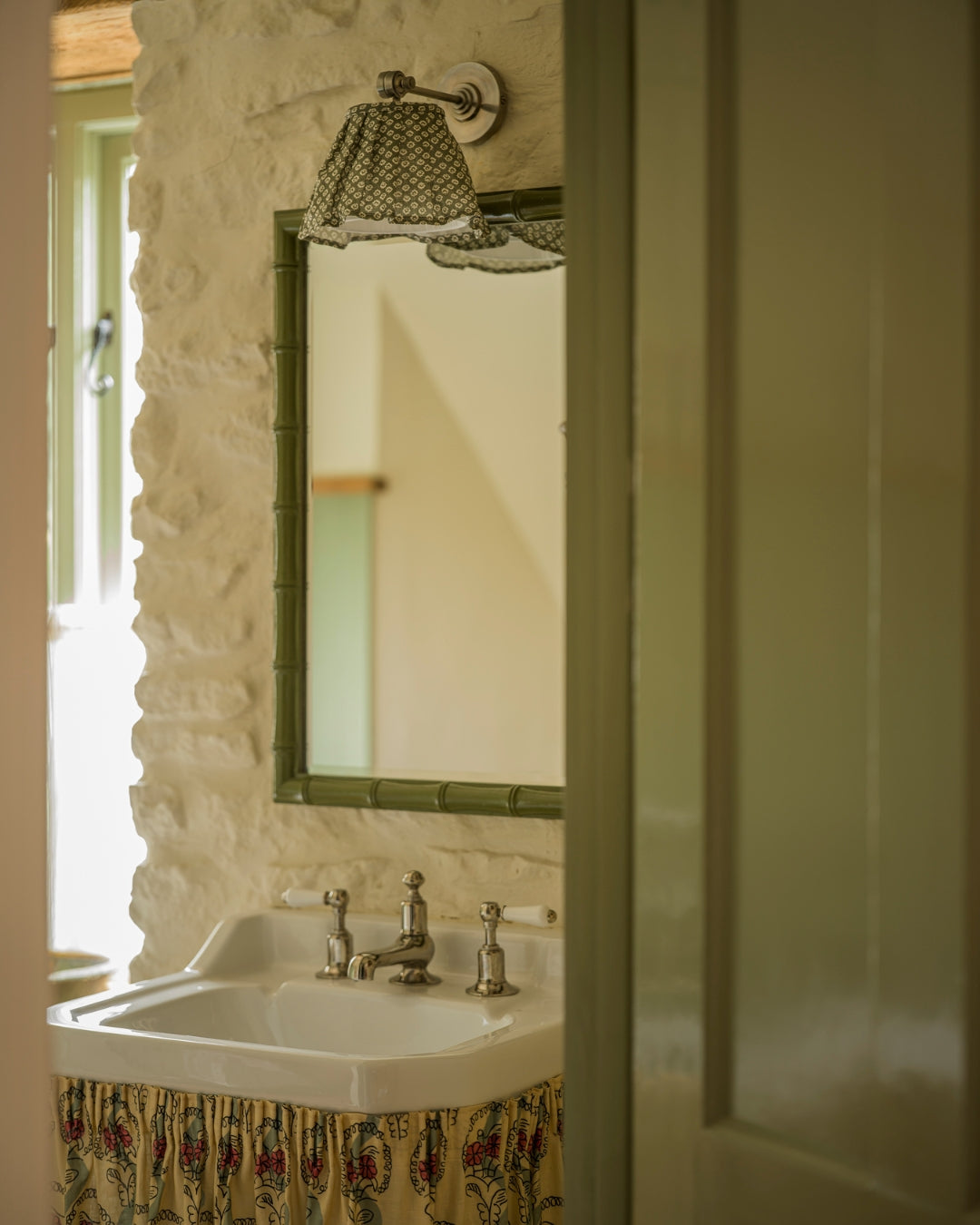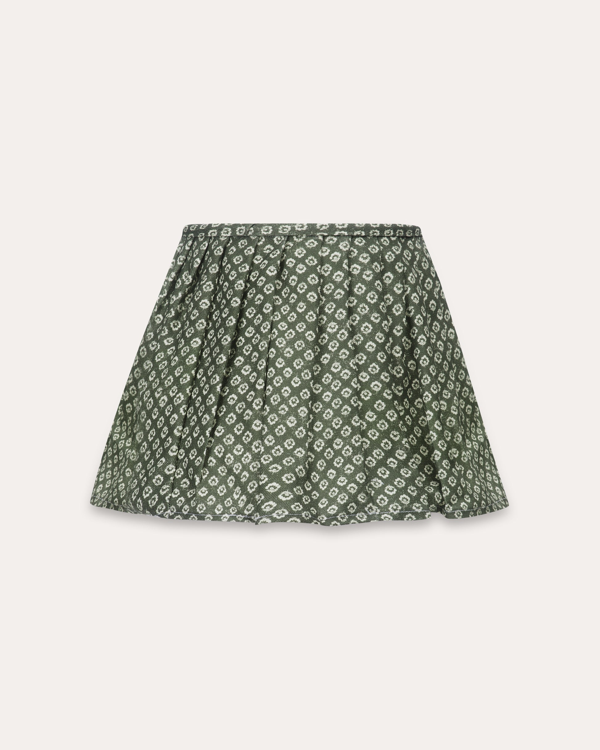 A soft flowing loose pleat lampshade made from 100% linen in Florina Moss – a small-scale floral motif in soft ivory, arranged in a rhythmic repeat across a deep green base. The pleating gives the design a graceful silhouette, while the richness of the green makes it beautifully grounding within a scheme.