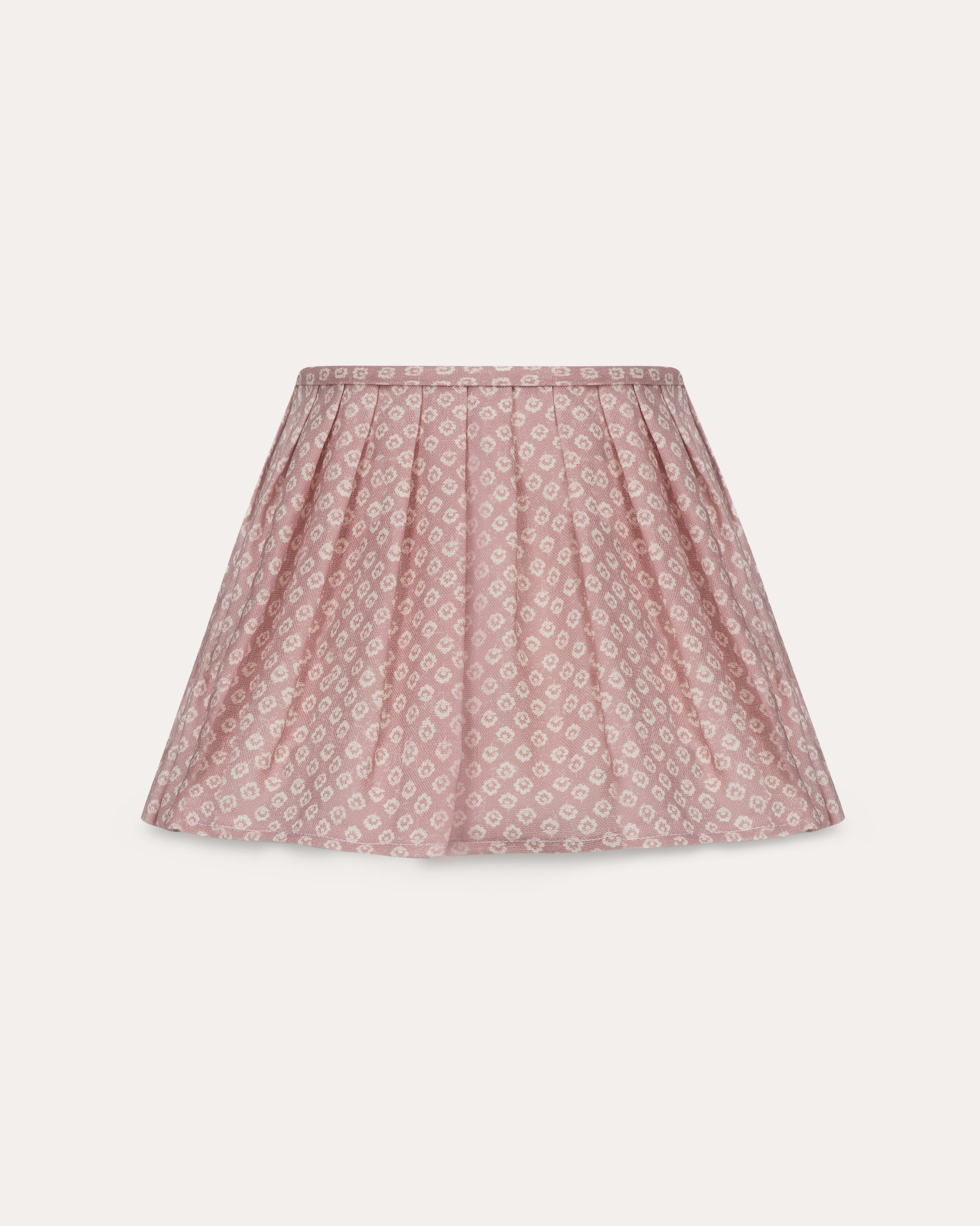 A soft flowing loose pleat lampshade made from 100% linen in Florina Old Rose – a small-scale floral motif in soft ivory, arranged in a rhythmic repeat across a dusky pink base. The pleating adds a gentle fullness to the fabric, creating a relaxed elegance that suits both traditional and modern interiors.