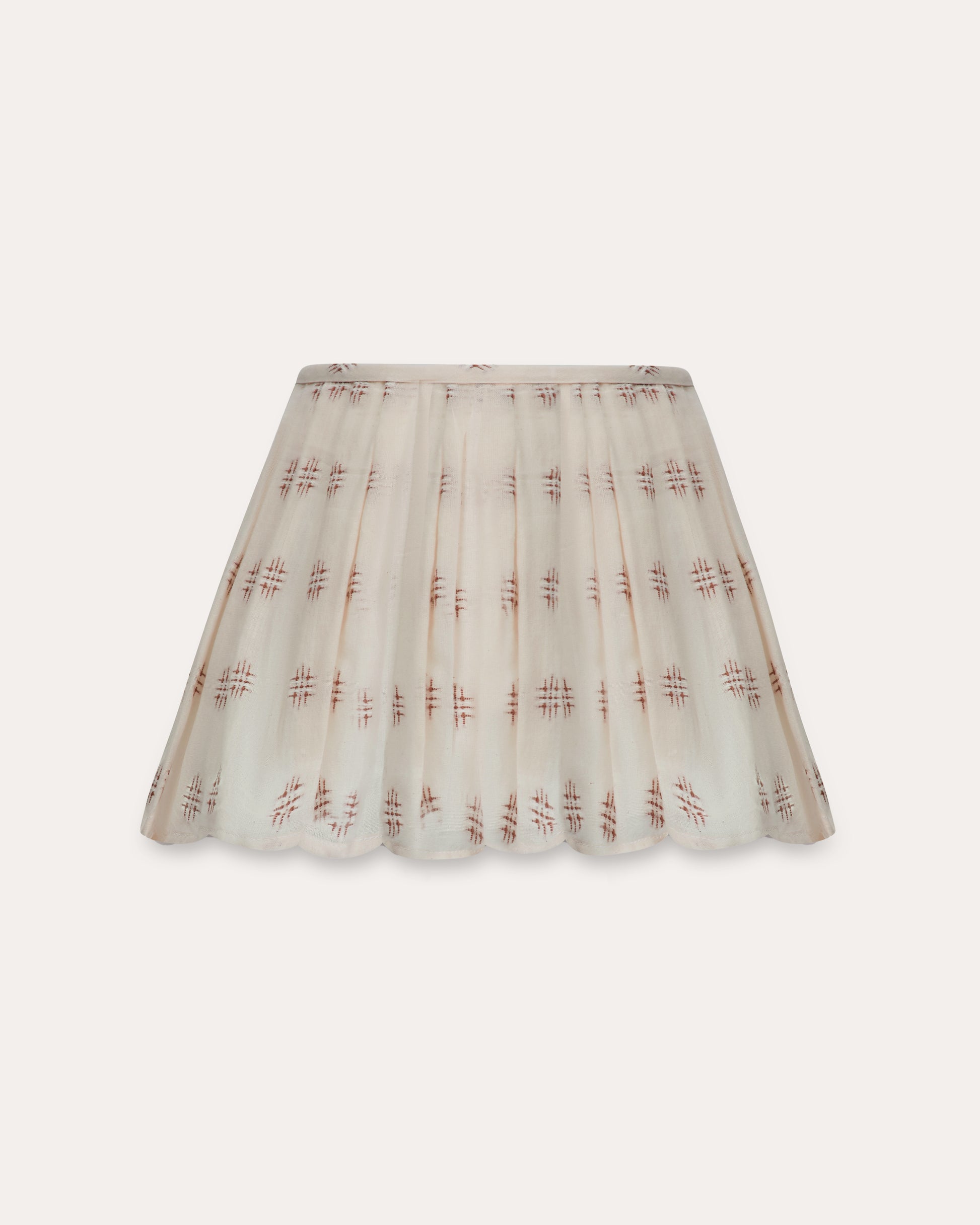 A patterned and loose skirted lampshade defined by its soft chestnut cross-stitch embroidery. Traditionally bound along its top edge, the lightweight, creamy cotton flows out freely below in a carefree fashion to lend a room a relaxed but considered touch.