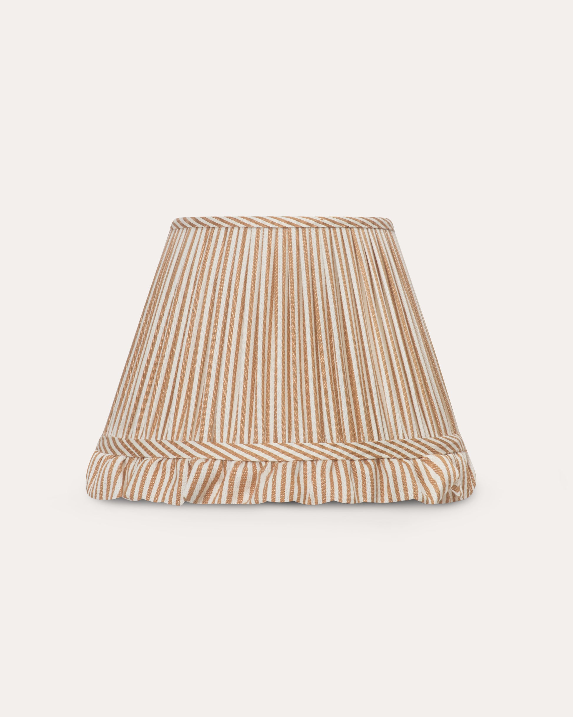 A frilled lampshade woven from a cotton and linen blend featuring a smart pinstripe in a warming shade of Ochre – a colour that’s deeper than apricot, more knocked back than tangerine and earthier than gold.