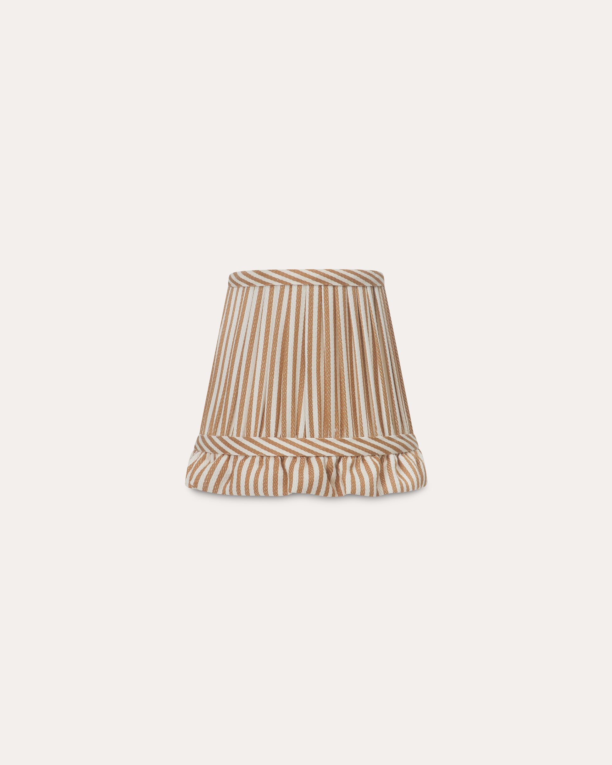 A frilled lampshade woven from a cotton and linen blend featuring a smart pinstripe in a warming shade of Ochre – a colour that’s deeper than apricot, more knocked back than tangerine and earthier than gold.