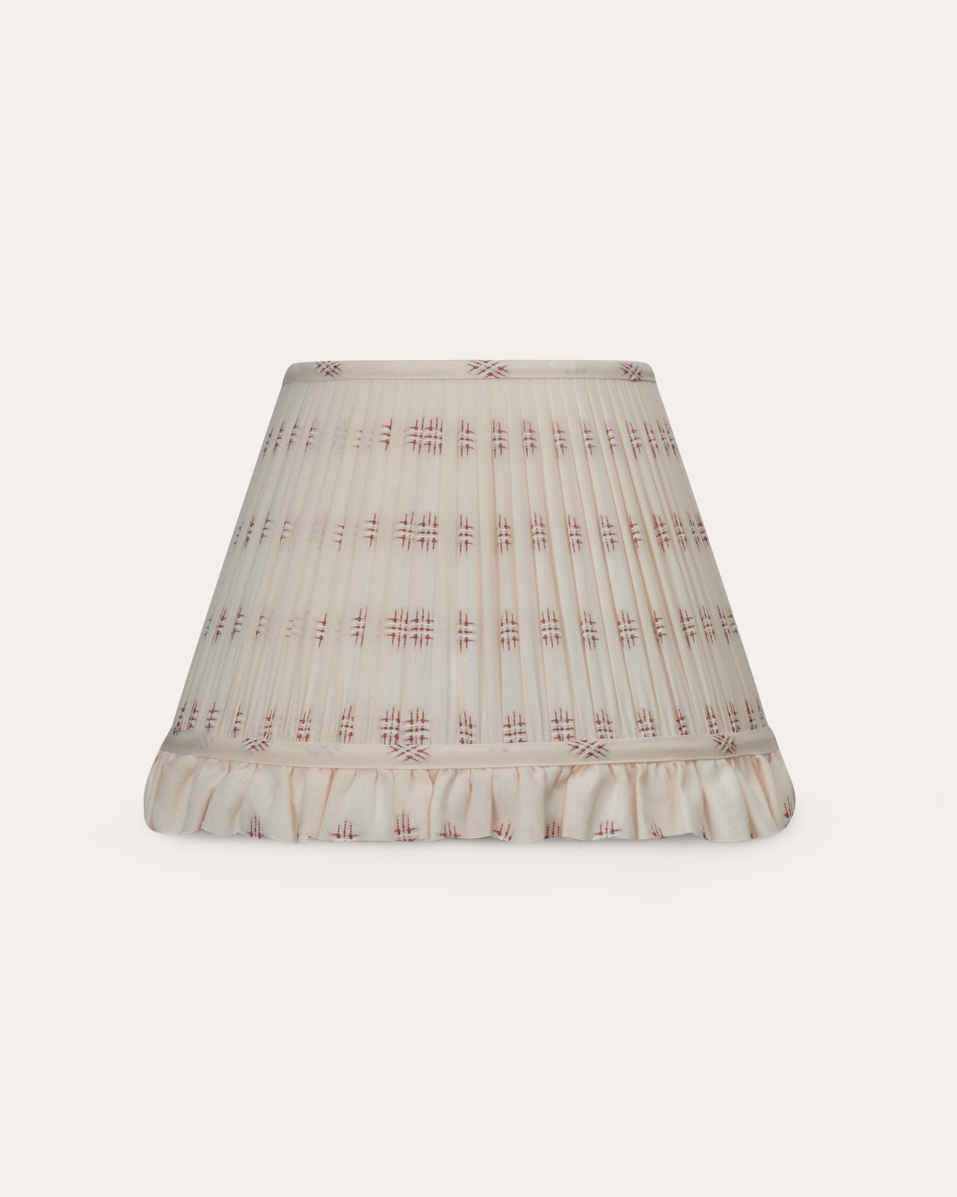 A patterned and ruffled lampshade defined by its delicate soft brown cross-stitch embroidery. Against a backdrop of our creamy lightweight cotton, the pairing is demure and gentle for bedside lamps or sitting room wall lights alike.